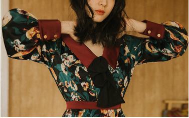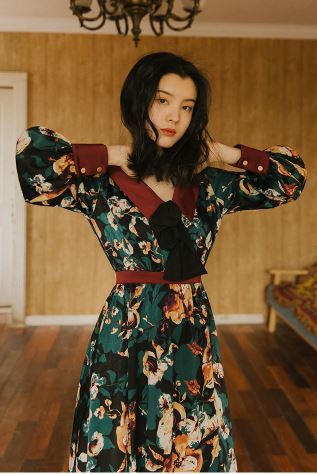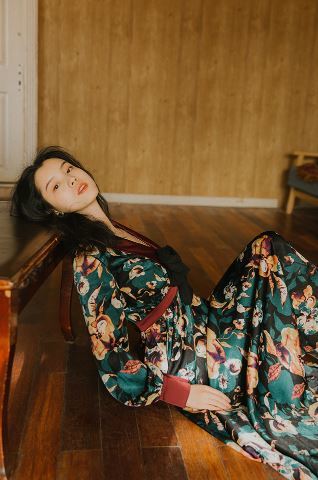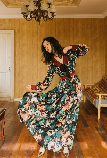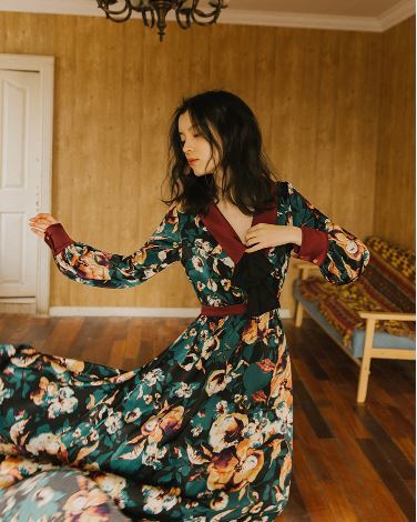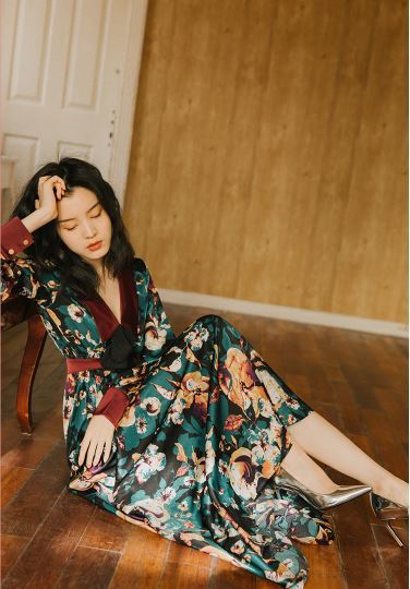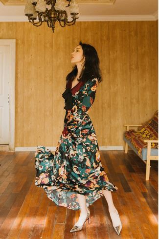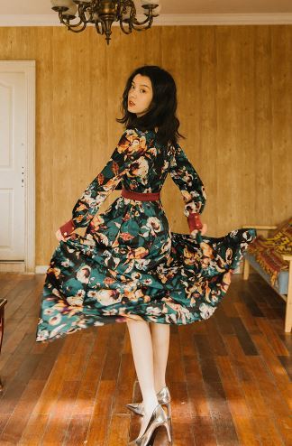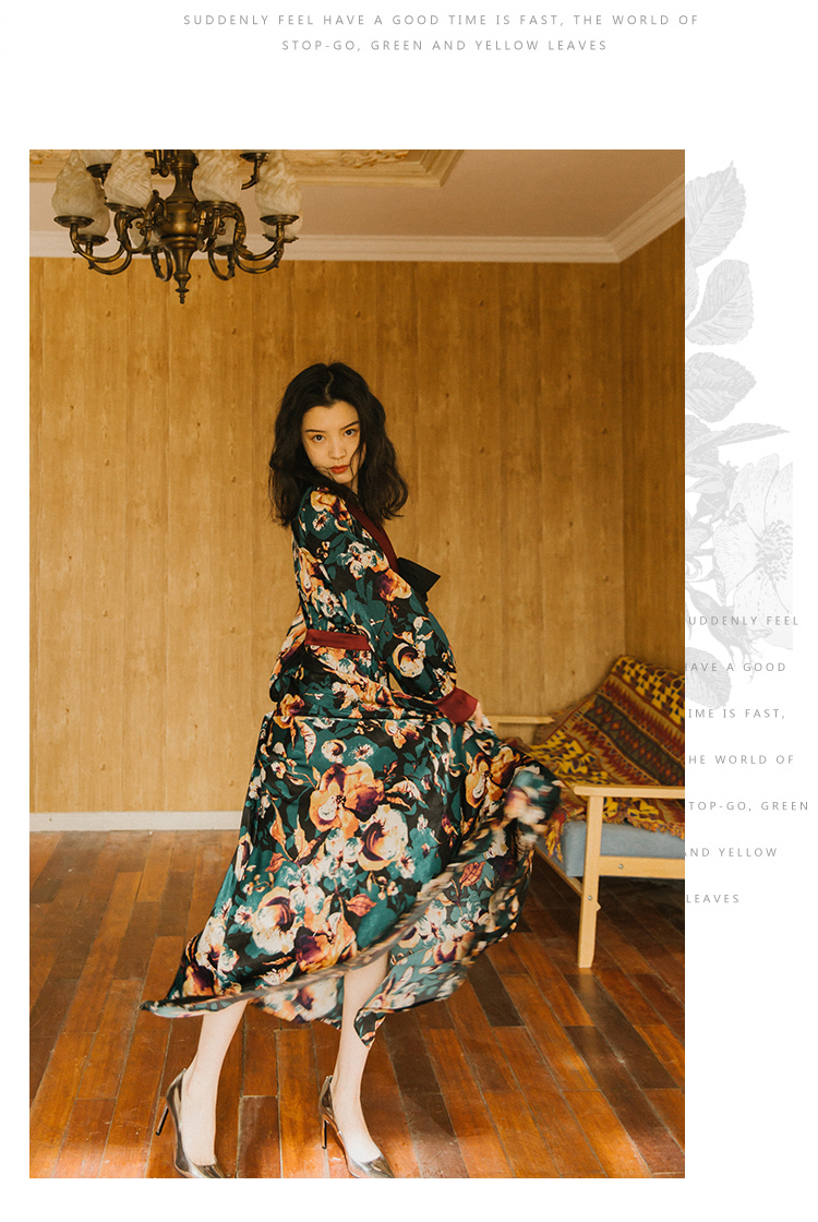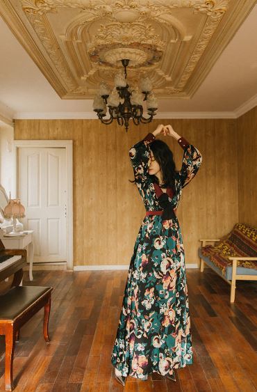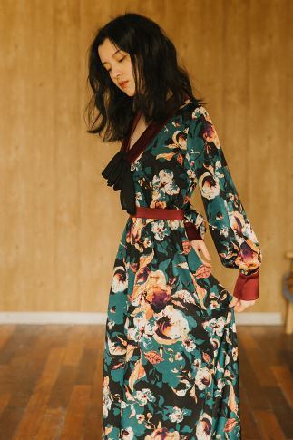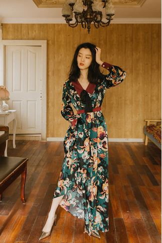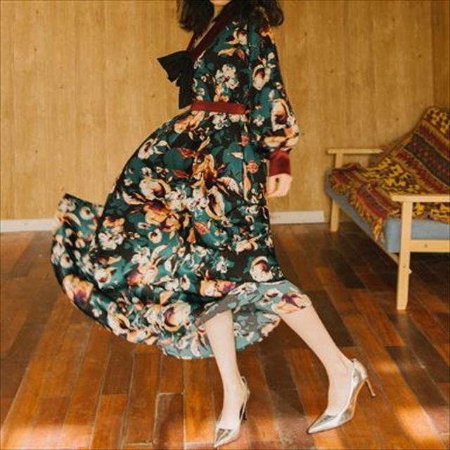 シックな中にも華やかさのあるボタニカル柄が目を惹くマキシ丈ワンピースのご紹介です。