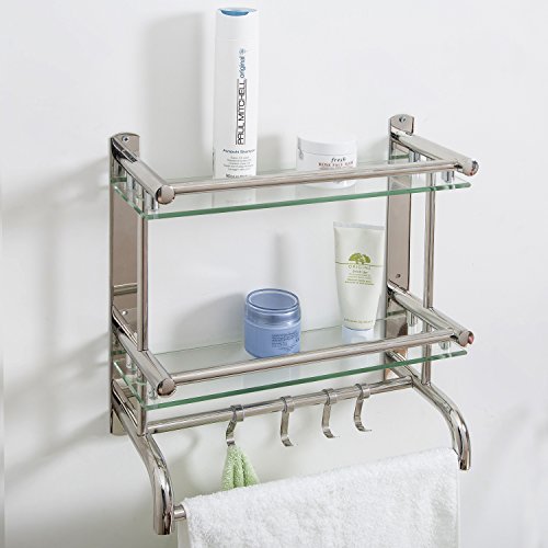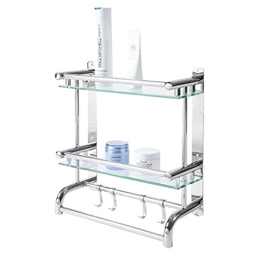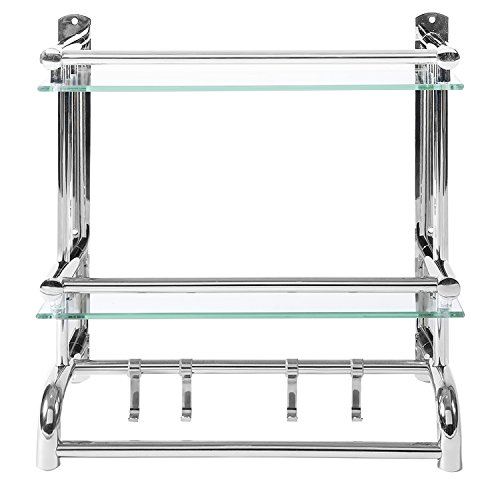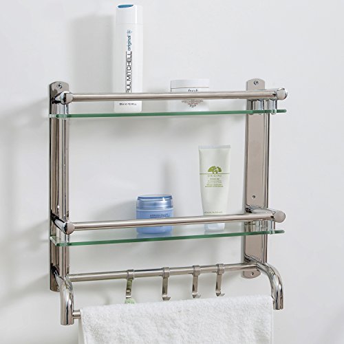 2 tier Stainless steel and glass shelves bathroom rack with towel bars and hanging hooks.