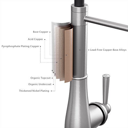 - Lead Free Material: NSF standard zinc alloy cover with multi matte brushed nickel, high temperature resistant nylon hose; PVD and Nano anti-fingerprints material helps your faucet stay cleaner & longer by resisting water spots and fingerprints