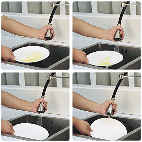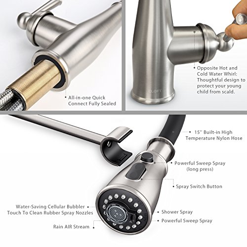 - Three Water Modes: Rain air stream / shower spray / Sweep spray(wide blade spray that powerfully cleans dishes, rinse thoroughly your sink and make kitchen clean up easier.) Different with normal kitchen faucet, our faucet come with opposite hot and cold water outlet to protect your kids from scald