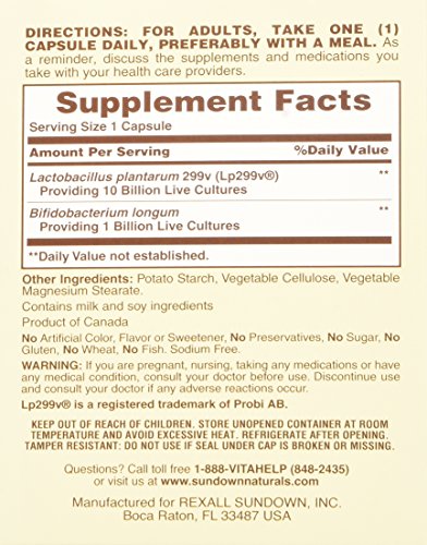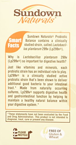 Sundown Naturals Probiotic Balance capsules support digestive, intestinal, and immune health help maintain your digestive system's natural balance. Just one capsule a day provides you with 10 billion active cultures to help maintain a favorable intestinal balance, and a favorable environment for the absorption of nutrients support healthy GI function and promote digestive health. Since a large percentage of the body's immune system is located in the gastrointestinal tract, Probiotic Balance also supports healthy immune function. Sundown Naturals Probiotic Balance contains a clinically studied strain, called Lactobacillus plantarum 299v (Lp299v). Why is Lp299v so important for digestive health? Just like vitamins and minerals, each probiotic strain has an individual role to play. Lp299v is a clinically studied active probiotic strain that's been shown to deliver additional good bacteria to your intestinal tract. Made from naturally occurring cultures, Lp299v supports digestive health and gastrointestinal function by helping to maintain a healthy natural balance within your digestive system.Feature