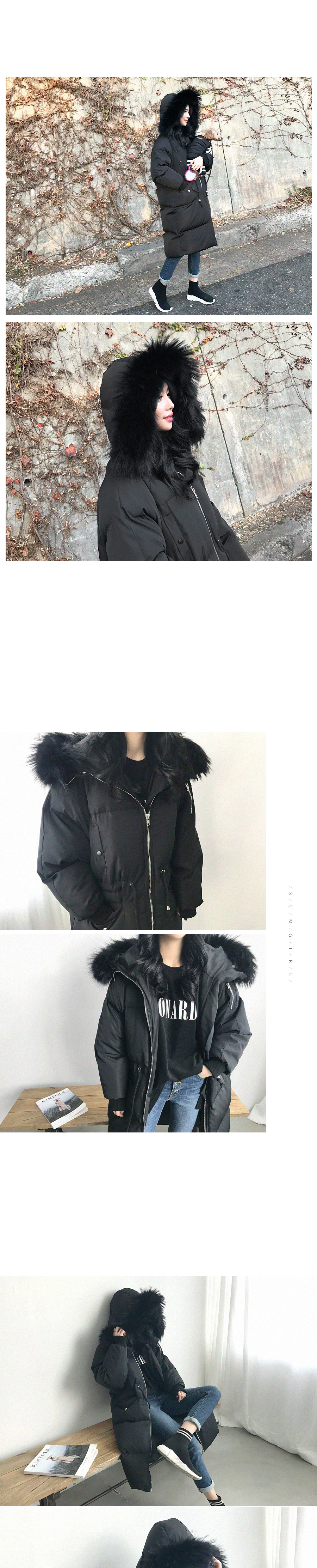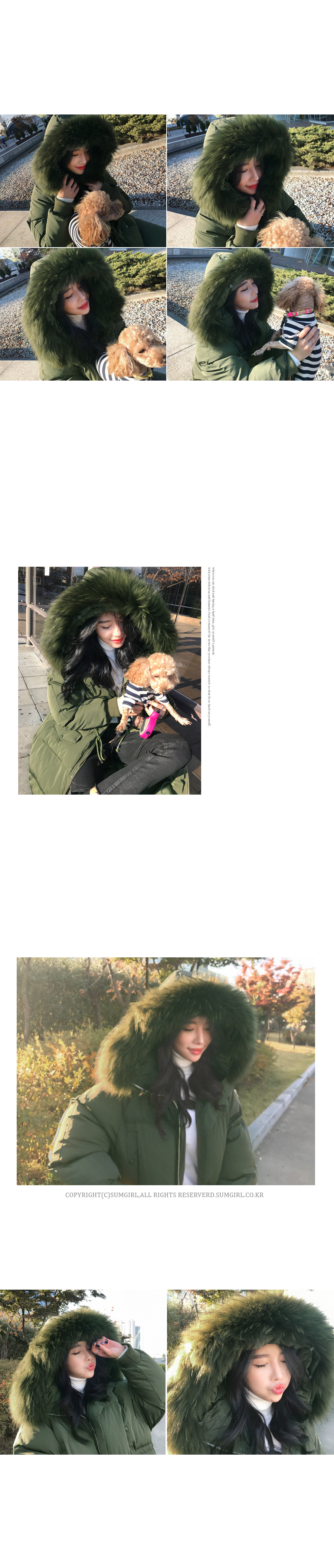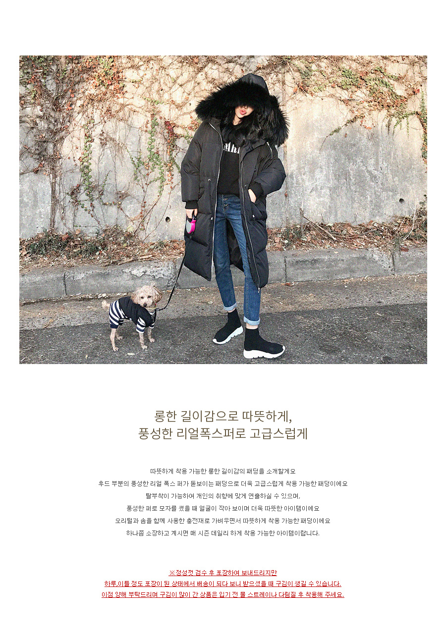 | 소재(Material) | 폴리(polyester/)100%/폭스퍼(foxfur/)/충전재(Filler/)오리솜털(duckdownyhair/)30%+솜(cotton/)70% | |