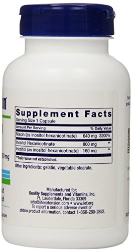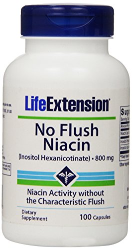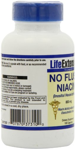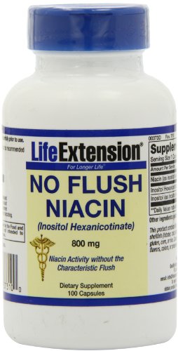 -. Binding : Health and Beauty -. Brand : Life Extension -. EAN : 0737870373100 -. Feature : Contains a special form of niacin (inositol hexanicotinate) consisting of 6 molecules of niacin / No Flush Niacin allows for true niacin activity without the characteristics niacin flush / 640 mg Niacin per serving / 800mg of inositol hexanicotinate per serving / 100 Servings per container -. IsAdultProduct : 0 -. Label : Life Extension -. LegalDisclaimer : * These statements have not been evaluated by the Food and Drug Administration. This product is not intended to diagnose, treat, cure or prevent any disease. **Always refer to the manufacturer's label on the product for description, recommended dose and precautions. -. Manufacturer : Life Extension -. MPN : 00373 -. NumberOfItems : 1 -. PackageQuantity : 1 -. PartNumber : 00373 -. ProductGroup : Health and Beauty -. ProductTypeName : HEALTH_PERSONAL_CARE -. PublicationDate : 2011-01-12 -. Publisher : Life Extension -. Size : 100 -. Studio : Life Extension -. Title : Life Extension No Flush Niacin 800 Mg , 100 Capsules -. UPC : 737870373100
