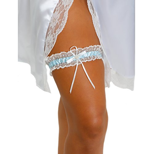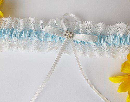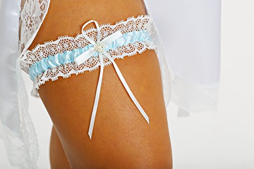 Ivory/Blue colored lace garter with a satin bow embellished with a rhinestone. Elastic to fit up to 24 inches around thigh. Guaranteed to stay on!