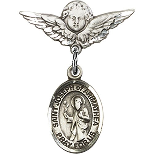 -. Title : Sterling Silver Baby Badge with St. Joseph of Arimathea Charm and Angel w/Wings Badge Pin 7/8 X 3/4 inches