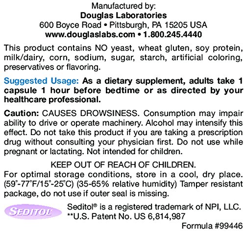 -. Binding : Health and Beauty -. Brand : Douglas Labs -. Label : Douglas Labs -. Manufacturer : Douglas Labs -. ProductGroup : Health and Beauty -. ProductTypeName : HEALTH_PERSONAL_CARE -. Publisher : Douglas Labs -. Studio : Douglas Labs -. Title : Seditol Plus by Douglas Labs, 30 Capsules