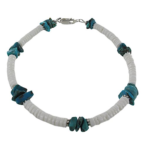 -. Title : Womens Turquoise Chips, White Clamshell & Sterling Silver Ladies Beaded Gemstone Anklet with Daisies