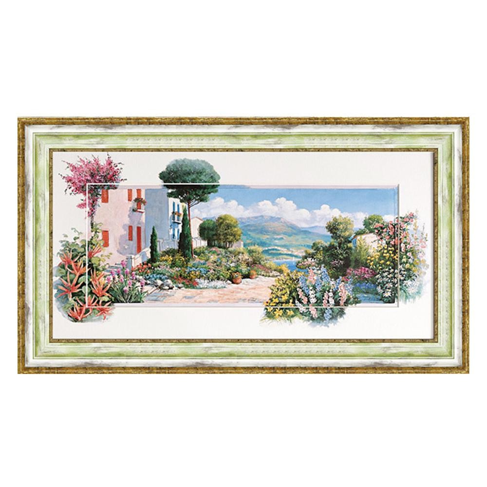 爽やかなグリーンのフレームにお花いっぱいの優しい雰囲気の風景画。女性に大人気。