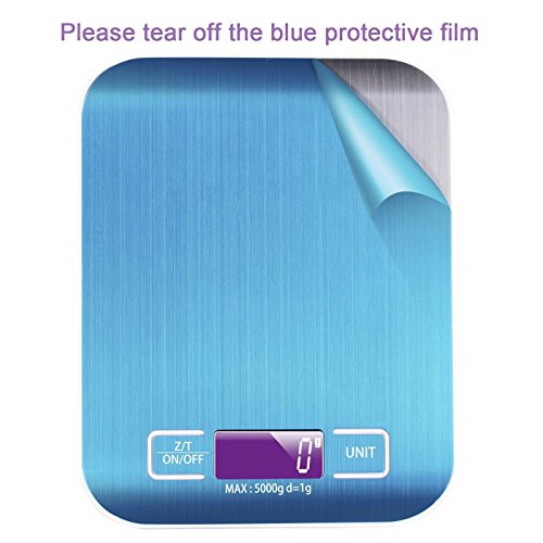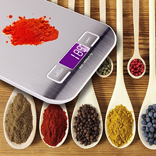 Food Scale, Premium Stainless Steel Multifunction Digital kitchen scale, High Precision Sensors with Capacity 11lb/5kg, 0.01oz/2g division, Silver (Batteries Included)
