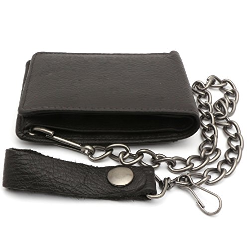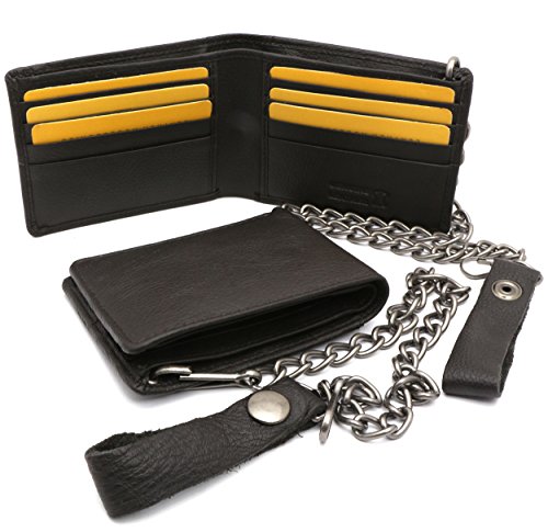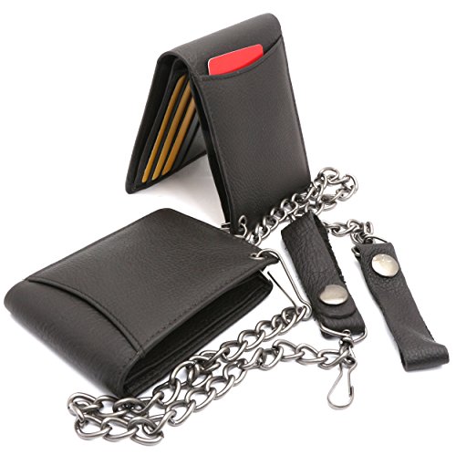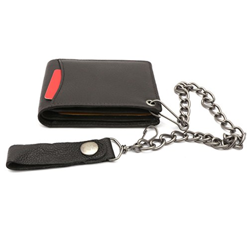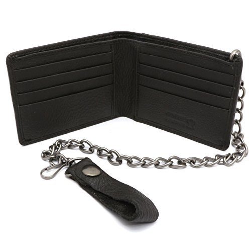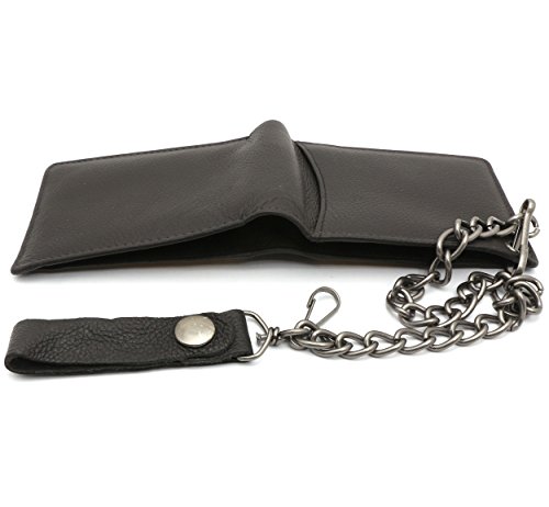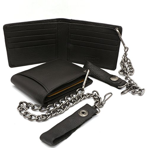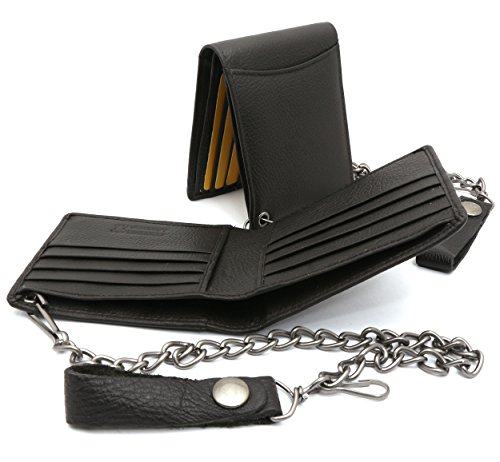 Product Description Bifold brown genuine leather wallet with 12 inch removable chain. Includes 1 cash pocket, 2 coin pockets, 8 card slots, and an outer pocket. 0