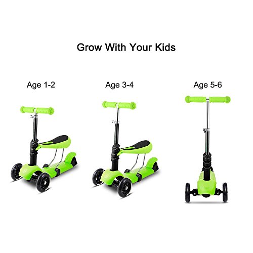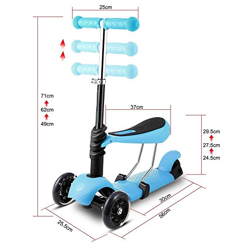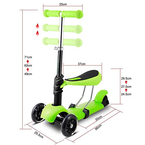 -. Feature : New & Improved Design Point 1 : Adjustable Removable Seat.The seat can be easily uninstalled/removable; Seat height from 24.5-27.5-29.5cm/9.6-10.8-11.6"inch.The Seat design idea for low age child.Sometime you will find the child don't need the seat anymore,yeah he/she grow up now,it's time to take it off. / New & Improved Design Point 2 : Adjustable Removable T Handlebar.The handbar with soft rubber grip which provide maximum comfort and soft to protect kid's hand. The T-bar height range from 49-62-71cm/19-24-28"inch tall that grows with children from age 2 to age 10.Max capacity up to 110 lbs.The scooter can develops kids balance, co-ordination and motor skills,it will accompany with the child's whole early childhood. / Super Cool LED Flash Wheels & Lean-to-Steer Mechanism and Rear Brake-Safety : Flash wheels Super-Cool at night,and it mark the position of children when kids play the scooter in envenning or dark enviroment.The Lean-To-Steer Mechanism is the best way for kids to learn balance and coordination.The extra long wide rear brake covers the entire wheel for more efficient braking. / Easy to Install & Disassembly : This scooter is easy to put together and without use any install tools. Two kinds of installation mode, two different riding methods.The seat and the handlebars can be easily removed from the deck by the push of a button. The scooter comes apart into pieces, making it easy to place in the car,take it to anywhere. / Package Content : 1 x Kick Scooter,1 x Manual