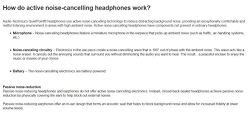 Audio-Technica's ATH-ANC9 QuietPoint headphones use proprietary active noise-cancelling technology to provide a comfortable listening environment in areas with high ambient noise. Delivering noise cancellation up to a remarkable 95%, the ATH-ANC9 QuietPoint headphones feature Audio-Technica's new Tri-Level Cancellation. Mode 1, ideal for use on airplanes, trains and buses, applies maximum noise cancellation to low frequencies. Mode 2, designed especially for use in noisy offices or crowded places, targets the mid-range frequencies, while Mode 3 creates a pristine, peaceful environment ideal for study. The headphones feature four miniature microphones, two in each earpiece, that pick up ambient noise and create a sound-cancelling signal to effectively block the noise. The ATH-ANC9 headphones also offer a cable with an inline microphone and controller for answering calls and controlling music. The mic and controller support select products, including iPhones, iPads, and many iPods. The microphone has an omnidirectional pickup pattern and it is designed for crisp intelligibility, so your voice will be clearly transmitted without having to speak directly into the mic. These headphones are designed to offer you crystal-clear sound that makes Audio-Technica the choice of leading artists worldwide. Wherever you happen to find yourself-in the comfort of your living room, in a noisy office, or settling in for a long flight-there is no better way to experience audio or immerse yourself in a peaceful environment.Feature