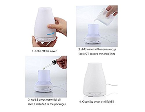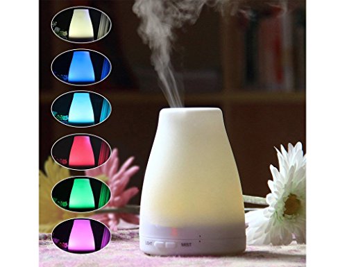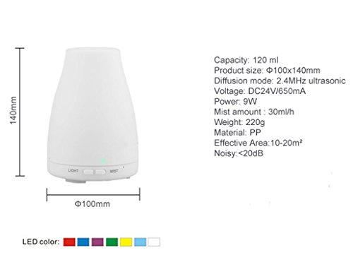 7 Color Changing LED Lamps so you can chose a color to match you mood - white, green, purple, pink, blue, yellow and red Auto Shut Off/120 ml Capacity.3.9 x 3.9 x 6.2 inches ; 12 ounces Portable for Gym, Yoga, Baby Room, Office, Bedroom. Envelop a space up to 150 sq feet of your favorite scent anywhere you go