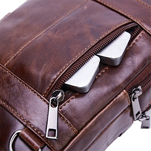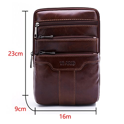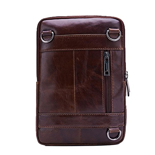 Material: 100% Genuine Leather Color: Dark Brown Size: 16 x 9 x 23cm /6.3 x 3.5 x 9.0 inch(LxWxH) Mini shoulder bag, Chest Bag, Messenger Bag Perfect for holding your mobile phone, iPad mini, wallet and carry some small items It's such a awesome messenger bag that you will receive many compliments from your family and friends