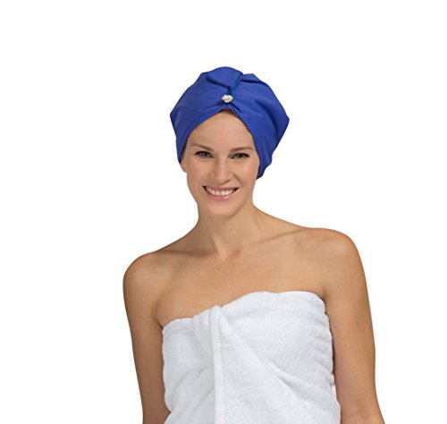 THE DAILY SHOWER HACK FOR HEALTHY HASSLE-FREE HAIR ~ Upgrade to the best shower cap AND most absorbent hair towel wrap with the only multi-tasking turban. It's designed for women with curly or straight, long or short hair. Just twist and fasten the Swarovski® crystal button to beautifully handle your hair at home, the gym and when you travel.