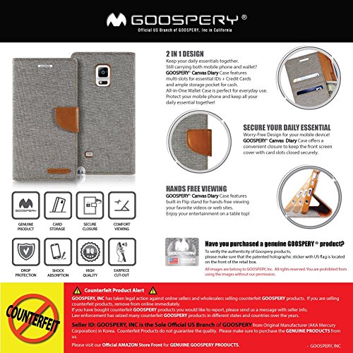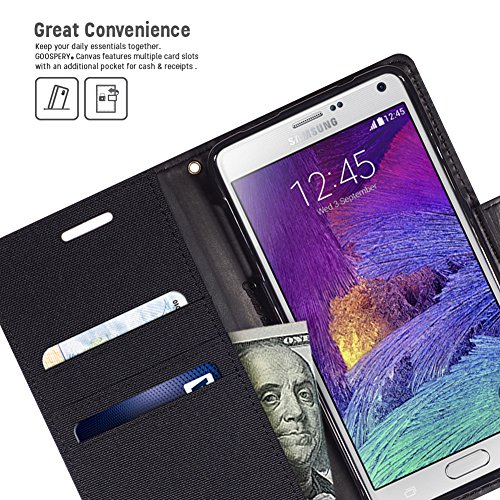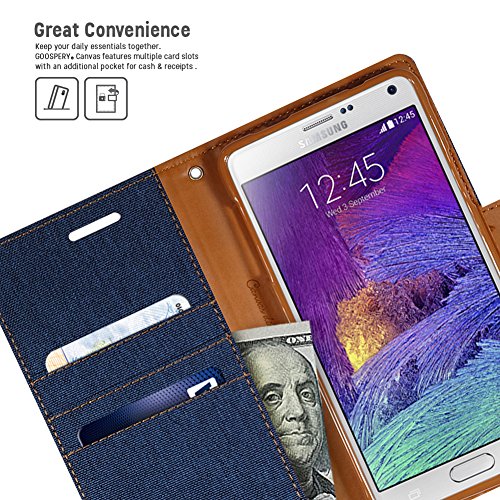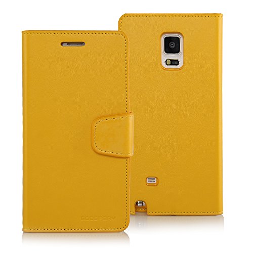 -. Binding : Wireless Phone Accessory -. Brand : GOOSPERY -. Feature : Stylish slim fit wallet case with mutiple credit card slots and a pocket for bills/receipts to eliminate the need for a separate wallet. / Stylish yet functional design; converts to a media stand with a magnet clasp for easy open with secure hold when closed. (The magnet does NOT affect the reception signal or any functions of the device.) / Made with Premium High Quality Soft Synthetic Leather cover for protection in case of drop. Inner case is made with Premium TPU for maximum shock absorption providing additional protection. / Earpiece cut-out for conversing with the cover closed. Designed and manufactactured with precise cut-outs & mold; perfect fit for your device. / Elegant leather texture with uni-form stitching; available in various colors. -. Label : GOOSPERY -. Manufacturer : GOOSPERY -. PackageQuantity : 1 -. ProductGroup : Wireless -. ProductTypeName : WIRELESS_ACCESSORY -. Publisher : GOOSPERY -. Studio : GOOSPERY -. Title : Galaxy NOTE 4 Case, [Drop Protection] Goospery® Fancy Diary [Wallet Case] Premium Synthetic Saffiano Leather Case [ID / Credit Card Slots + Cash Pocket] Cover for Samsung Galaxy Note 4