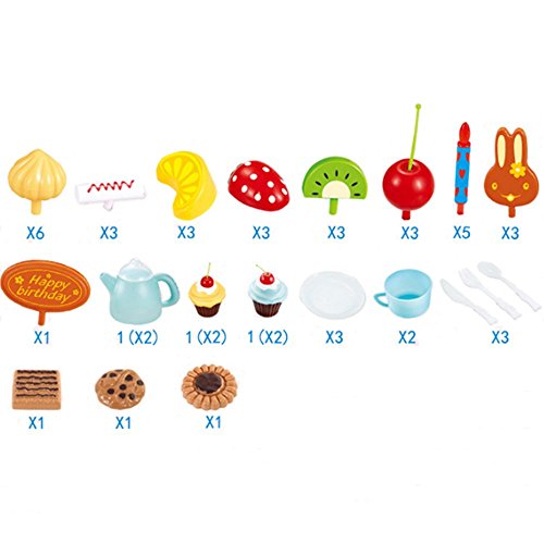 -. Feature : Package size:11x8x3. 9(cm). / Package included:cup(2pcs), plates(3pcs), cookies(3pcs), spoon(1pcs), fork(1pcs), knife(1pcs),teapot accessories(2pcs), cake(6pcs), cake cutter(1pcs), dessert accessories(4pcs), decorations(30pcs). / Great educational toy is also a perfect cosplay toy kit for your kids. Your kids could play different roles by the kit with the family members or their friends. It also helps the kids learn to communicate and share. / Suitable for the kids who is 1 years and up. / It is made of soft abs,which is environmentally friendly. So you could be feel relieved to let your kids play by the kit.