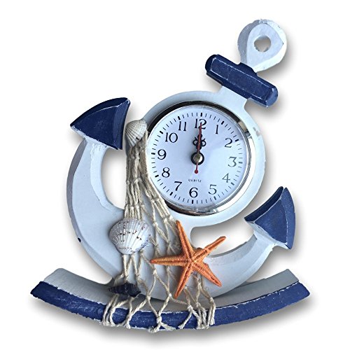 ANCHOR CLOCK. Cute navy blue and white clock in the shape of an anchor. Features starfish, sea shells and a fishnet. Decorative desktop clock with an ocean theme are great for an office, bedroom, bathroom, lake/beach house or cabin.