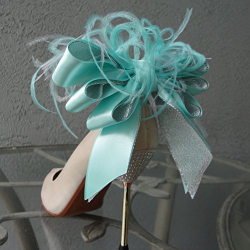 -. Title : Detachable Aqua and Silver Satin Bow and Feather Shoe Clips. Set of two