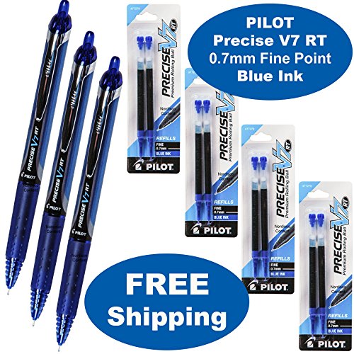 Deal consists of: 3 each, Pilot Precise V7 RT 26068 blue ink 0.7mm rolling ball pens, plus 4 packs 0.7mm refills 77279 with 2 refills per pack. Pilot Precise V7 RT has a unique liquid ink formula that maintains consistent flowing strokes and delivers incredibly smooth skip-free writing. Pens have a rubber grip with traction pockets. Retractable tip.