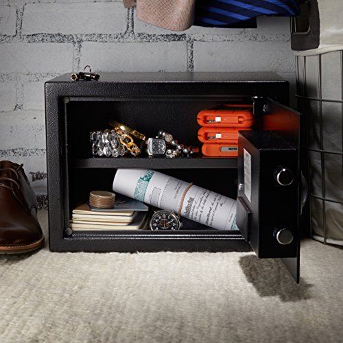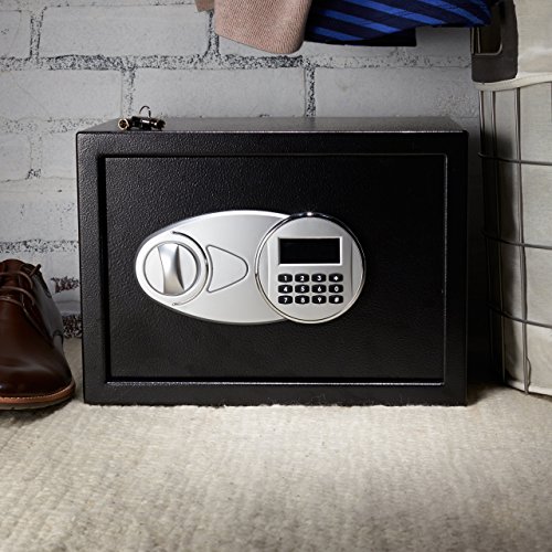 -. Binding : Tools & Home Improvement -. Brand : AmazonBasics -. EAN : 0841710101973 -. Feature : 0.5-cubic-foot security safe with electronic lock and 2 emergency override keys / Steel construction with carpeted floor to protect against scratches and damage; Safe is not fireproof or waterproof / 2 live-door bolts and pry-resistant concealed hinges; adjustable/removable interior shelf / Reprogrammable digital access; uses AA batteries (not included); Four bolts included to mount safe to wall, floor, or shelf / Exterior measures 13.8 by 9.8 by 9.8 inches (L x W x H); Interior space measures 13.5 x 8.75 x 9.5 inches (L x W x H) and door is approximately 2 inches thick -. Label : AmazonBasics -. Manufacturer : AmazonBasics -. Model : 25EI -. MPN : 25EI -. PartNumber : 25EI -. ProductGroup : Home Improvement -. ProductTypeName : SECURITY_ELECTRONICS -. Publisher : AmazonBasics -. Studio : AmazonBasics -. Title : AmazonBasics Security Safe 0.5 Cubic Feet -. UPC : 841710101973