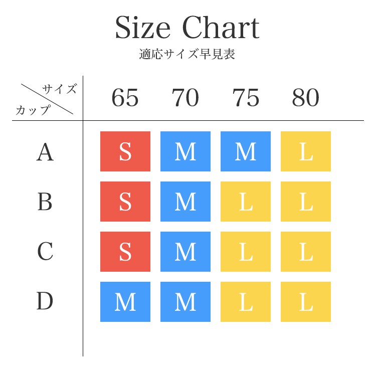 | サイズ | 70A アンダー 68~72cm、トップ 80~82cm 70B アンダー 68~72cm、トップ 82~84cm 70C アンダー 68~72cm、トップ 84~86cm 75A アンダー 73~77cm、トップ 85~87cm 75B アンダー 73~77cm、トップ 87~89cm 75C アンダー 73~77cm、トップ 89~91cm 80A アンダー 78~82cm、トップ 90~92cm 80B アンダー 78~82cm、トップ 92~94cm 80C アンダー 78~82cm、トップ 94~96cm 85A アンダー 83~87cm、トップ 95~97cm 85B アンダー 83~87cm、トップ 97~99cm 85C アンダー 83~87cm、トップ 99~101cm |