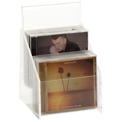 Product Description These clear acrylic CD racks are sold in sets of 4. The tabletop media storage holders offer 2 tiers in which compact discs are stored. The clear acrylic CD racks can hold up to 10 compact discs per unit - each tier storing 5 regular-sized CDs. These tabletop media storage holders also have a separate section for displaying a 5"w x 2"h sign. This is especially helpful when using the clear acrylic CD racks in commercial settings.
