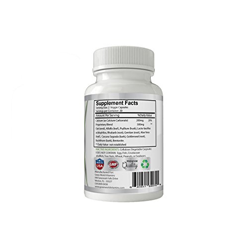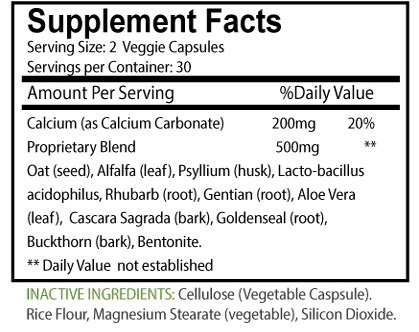 Green World Vitamins Colon Detox Herbal Cleanse contains 200mg of Calcium and 500mg of a Proprietary Blend that includes Oat Seed, Alfalfa Leaf, Psyllium Husk, Lactobacillus Acidophilus, Rhubarb Root, Gentian Root, Aloe Vera Leaf, Cascara Sagrada Bark, Goldenseal Root, Buckthorn Bark, and Bentonite.