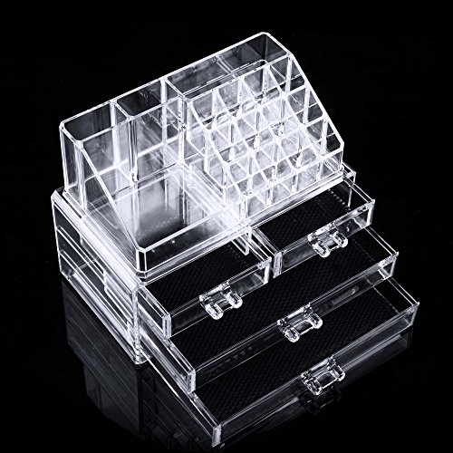 Large Storage Capacity - 4 drawers on the bottom organize eyeshadow, powder, long brushes and jewelries, 16 compartments of different sizes on the top to organize brushes, nail polishes and lipsticks, brushes