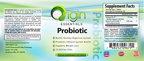 -. Binding : Health and Beauty -. Brand : Origin Essentials -. EAN : 9856457584973 -. Feature : 200% MORE CFUS PER SERVING THAN OTHER PROBIOTIC SUPPLEMENTS that improves Digestive Health and Promotes Daily Relief from IBS symp including Gas, Bloating, Constipation and Diarrhea. / BEST QUALITY PROBIOTIC SUPPLEMENT THAT IMPROVES ENERGY LEVELS. Origin Essentials Probiotics help fights off the bad bacteria present in the GI track which helps you recover from Chronic Fatigue Syndrome, gut illnesses caused by Stress, and Inflammatory Conditions such as IBS (Irritable Bowel Syndrome) and IBD (Inflammatory Bowel Disease). / STRICT GMP AND FDA CERTIFIED LAB, MADE IN THE USA for Maximum Quality Probiotics that require NO Refrigeration and are Dairy Free, Gluten Free and Vegan. 100% Safe and Natural made product with NO chemicals, preservatives, fillers or blenders / NATURALLY PROMOTES WEIGHT LOSS AND IMMUNE SYSTEM HEALTH which Helps to Control Appetite, Increases Calcium Absorption for Bone Density, and Supports More Vitamin Absorption. / LEADING EDGE SCIENTIFIC FORMULA. Origin Essentials Probiotics are formulated with Unique IS-2TM Bacillus Coagulans for superior potency, effectiveness, and stability. Stable for 3 years, and tested at temperatures up to 200°C without losing viability. -. IsAdultProduct : 0 -. Label : EBITDAFY LLC -. Manufacturer : EBITDAFY LLC -. MPN : 4-06001 -. PackageQuantity : 1 -. PartNumber : 4-06001 -. ProductGroup : Health and Beauty -. ProductTypeName : HEALTH_PERSONAL_CARE -. Publisher : EBITDAFY LLC -. Studio : EBITDAFY LLC -. Title : #1 Best Probiotics Supplement - Gluten Free, Dairy Free & Vegan - Naturally Produces Digestive Enzymes - Recommended for Men and Women to Improve IBS and Colon Health - 60 Day Supply