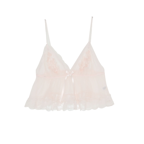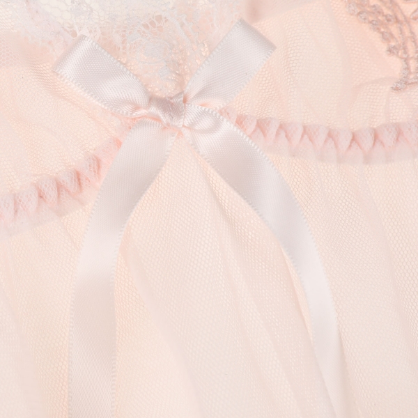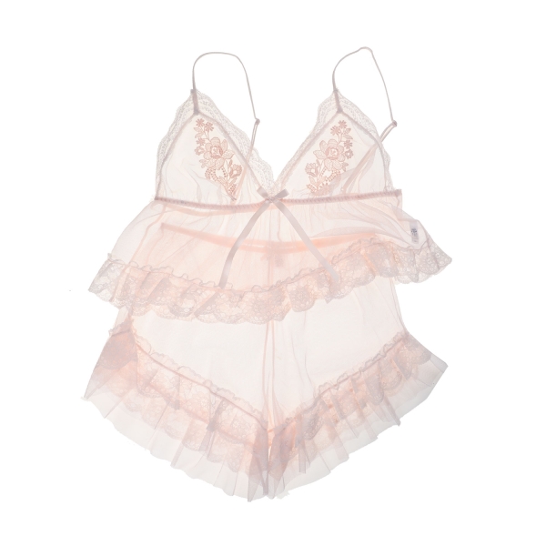 은은한 라이트 핑크 컬러감의 시스루 육각망 소재 위에 우아한 자수 포인트가 있는 케미 상하의 제품.
