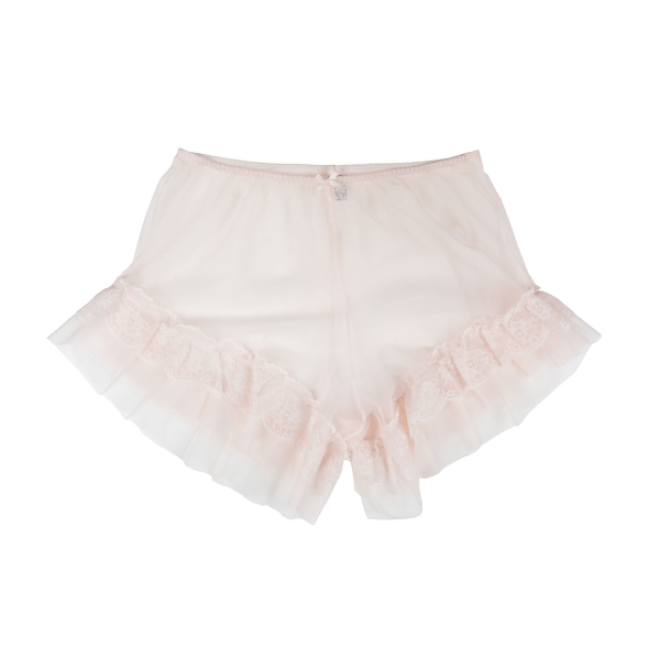하의의 라운드 라인으로 화려하게 들어간 레이스와 매쉬 프릴이 사랑스러움을 더해주는 디자인.