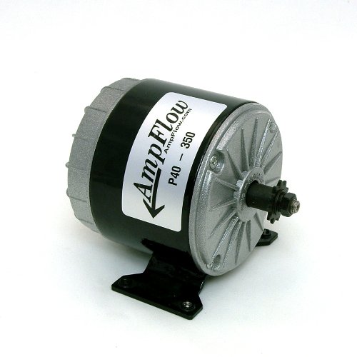 The AmpFlow P40-350 is a high-torque "pancake"-style motor designed to deliver good performance and efficiency at an economical price. This is achieved by the use of four brushes and advanced electromagnetic computer modeling and design. The P40-350 motor is 4.0 inches in diameter and 4.3 inches long. The shaft rides in two high-quality ball bearings. The heavy-gauge motor leads are 20 inches long. The motor weighs 5.6 pounds and it is finished in a high-quality black powder-coat.this reversible motor can be used at voltages ranging from 12V to 36Vdc. At 24 Volts it has the following performance: the no-load speed is 3500 RPM. The rated power output is 350W at 2900 RPM at 19 Amps. Peak efficiency is 79 percent this motor is supplied with an 11-tooth sprocket for #25 roller chain. The AmpFlow P40-350 motors are used in diverse applications including robots, electric scooters, and electric bicycles. Search Amazon for “AmpFlow motors” for more choices.Feature