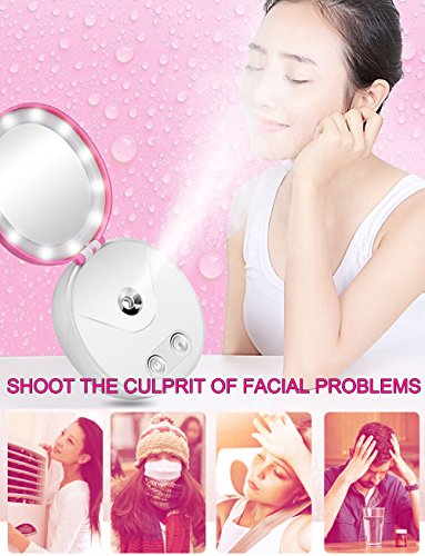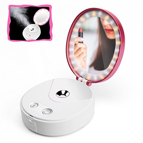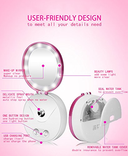 - * MULTIFUNCTIONAL AND PORTABLE - This is a set of Nano moisturizing sprayer, make-up mirror with beauty lights, power charger in one device. Small size for handy, which can be fit into your handbag or pocket, easy to carry. Convenient for you to moisturize skin anywhere anytime, making facial skin elastic and tender.And the HD mirror for convenient use to make up. Best for personal use, or as a gift.