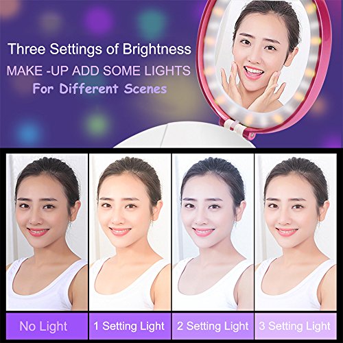 - * SLEEK LIGHTED HD MIRROR WITH LED LIGHTS - Clamshell Design it is easy to hold or put it on the desk, easier for using the mirror to make up. Natural and Bright comfortable Lighting with 3 settings to adjust brightness, provide a clean and bright reflection and allow you to get the most natural application of makeup, even at night.And also you can look into the mirror when moisturizing and hydrating your skin at the same time.