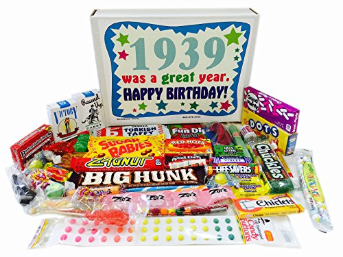-. Binding : Misc. -. Brand : Woodstock Candy -. Feature : Makes a fun and unique 78th birthday gift for someone born in 1939 / Perfect for the person who has everything / Everyone loves candy! / Comes shrink wrapped in a box that measures 11.75" x 9" x 2.25" / Box reads "1939 was a Great Year. Happy Birthday!" -. IsAdultProduct : 0 -. Label : Woodstock Candy -. Manufacturer : Woodstock Candy -. PackageQuantity : 1 -. ProductGroup : Grocery -. ProductTypeName : GROCERY -. Publisher : Woodstock Candy -. Studio : Woodstock Candy -. Title : 78th Birthday Gift Box of Nostalgic Retro Candy from Childhood for a 78 Year Old Man or Woman Born in 1939