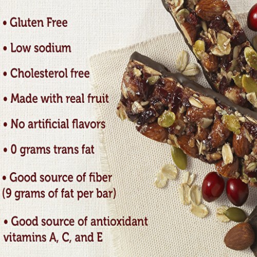 Feature : A gluten free and cholesterol free snack bar / Delicious source of fiber and antioxidant vitamins A, C, and E made with real fruit / Low sodium with 0 grams trans fat / Extraordinarily delicious snack bars made with real fruit, whole roasted almonds, and signature Brookside dark chocolate / Includes one box of 12 Brookside Dark Chocolate Fruit and Nut Bars in Cherry with Pomegranate Flavor