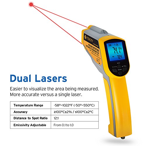 - BETTER ACCURACY + DUAL LASER: Dual laser technology makes it easier to see the area and surface being measured. 12:1 Distance to spot ratio allows you to measure temperatures ranging from -58°F to 1022°F (-50°C to 550°C) from a safe distance, which make sure the safety of your hand compared to other instant read thermometer