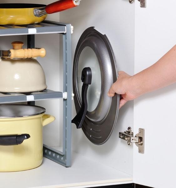 サイズ兼用で鍋やフライパンに使える料理蓋です。折りたたみ式ハンドルは収納スペースをとらず、使用時も長めのグリップでしっかり持てます。