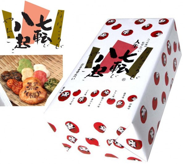 だるまの形と8種類の味わいがお楽しみいただけます。味のバランスと素材にもこだわった一口サイズのおせんべいです。転んでも必ず起き上がることができるという意味の、縁起のよいネーミングです。 |