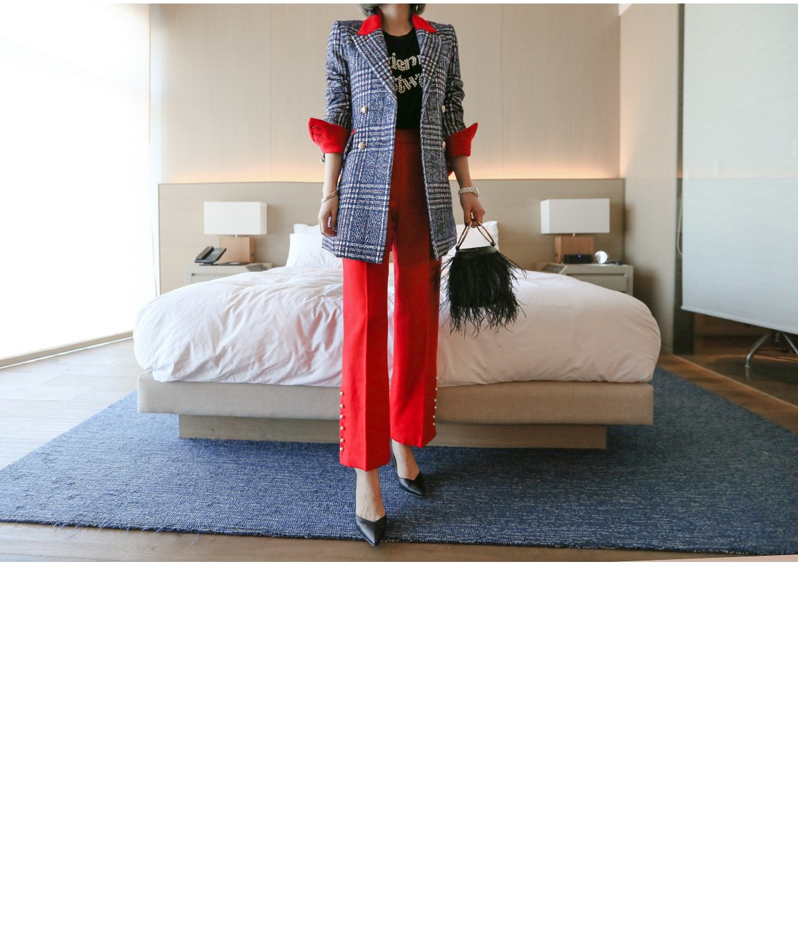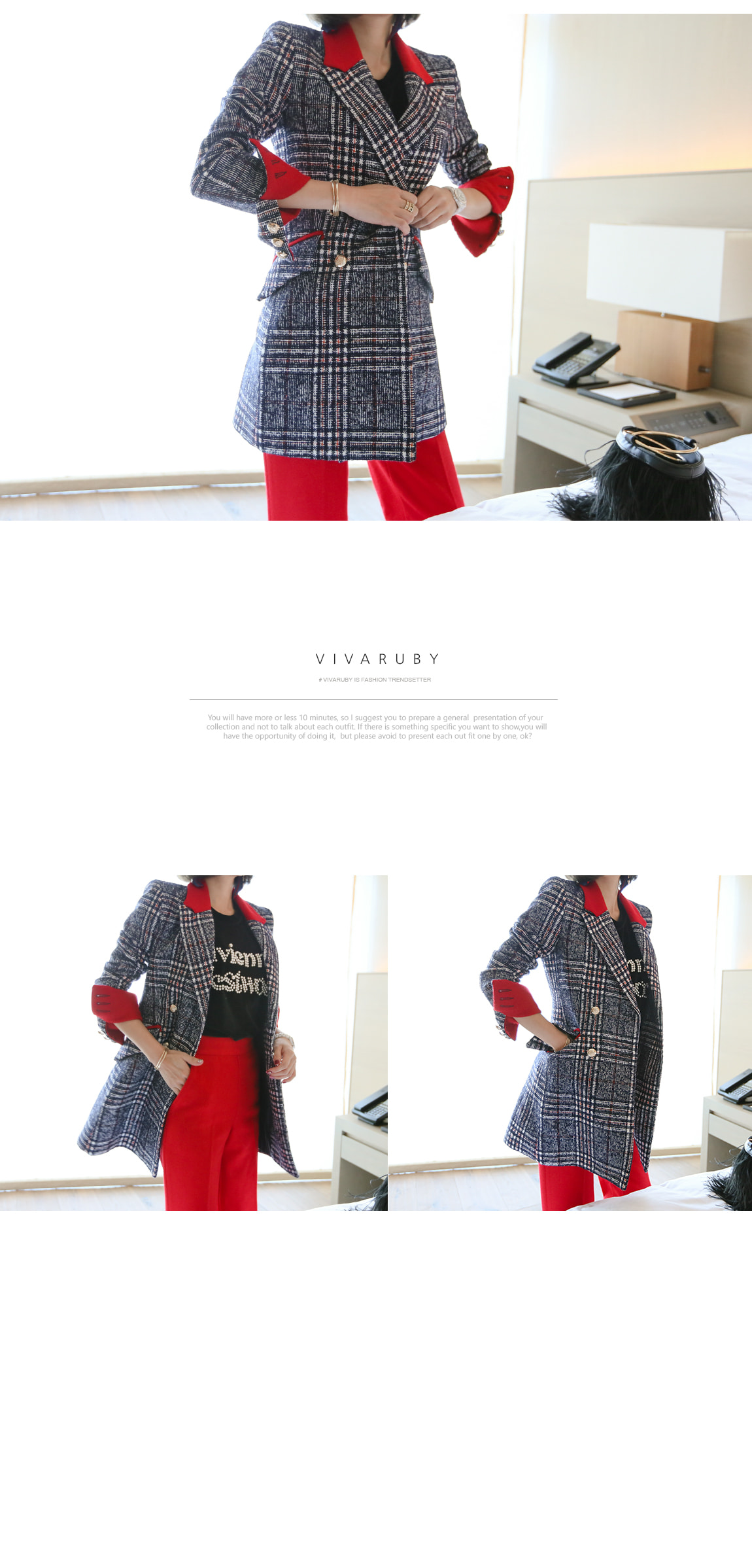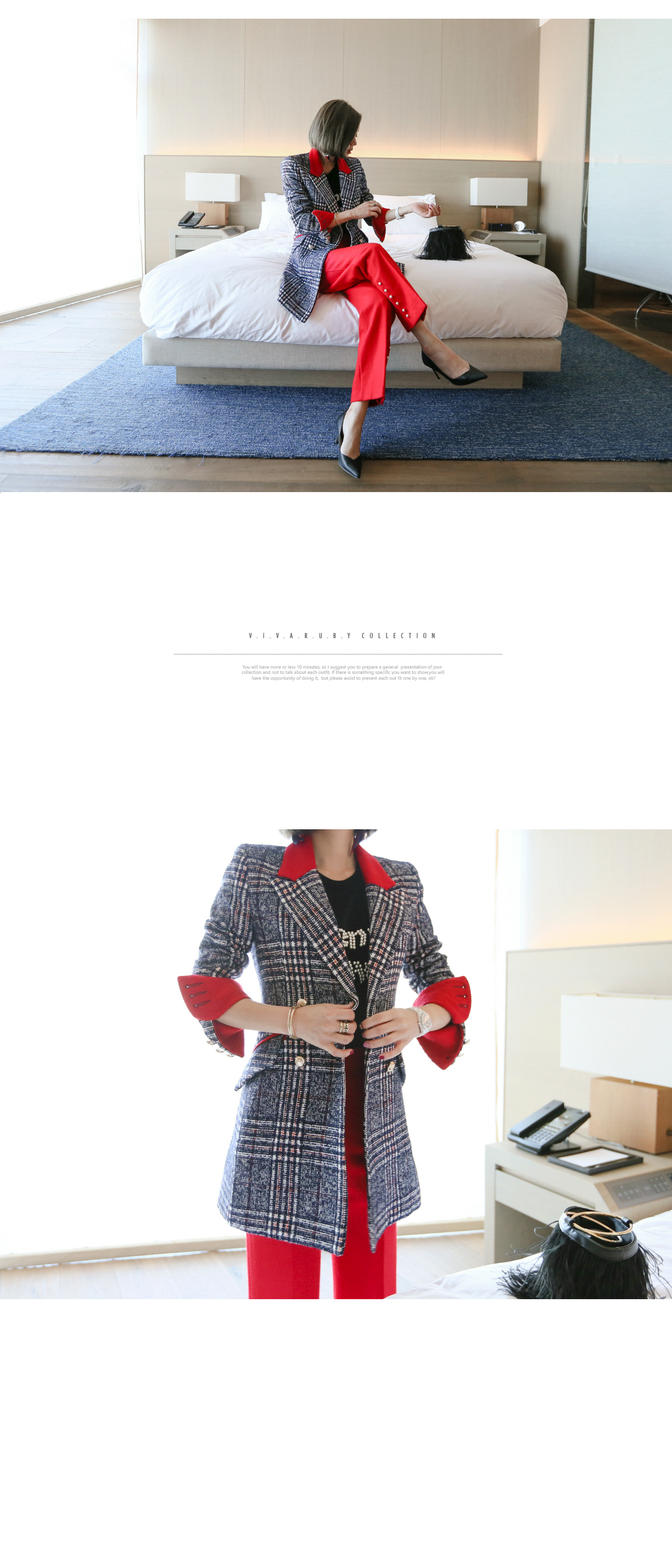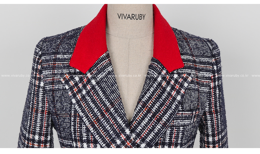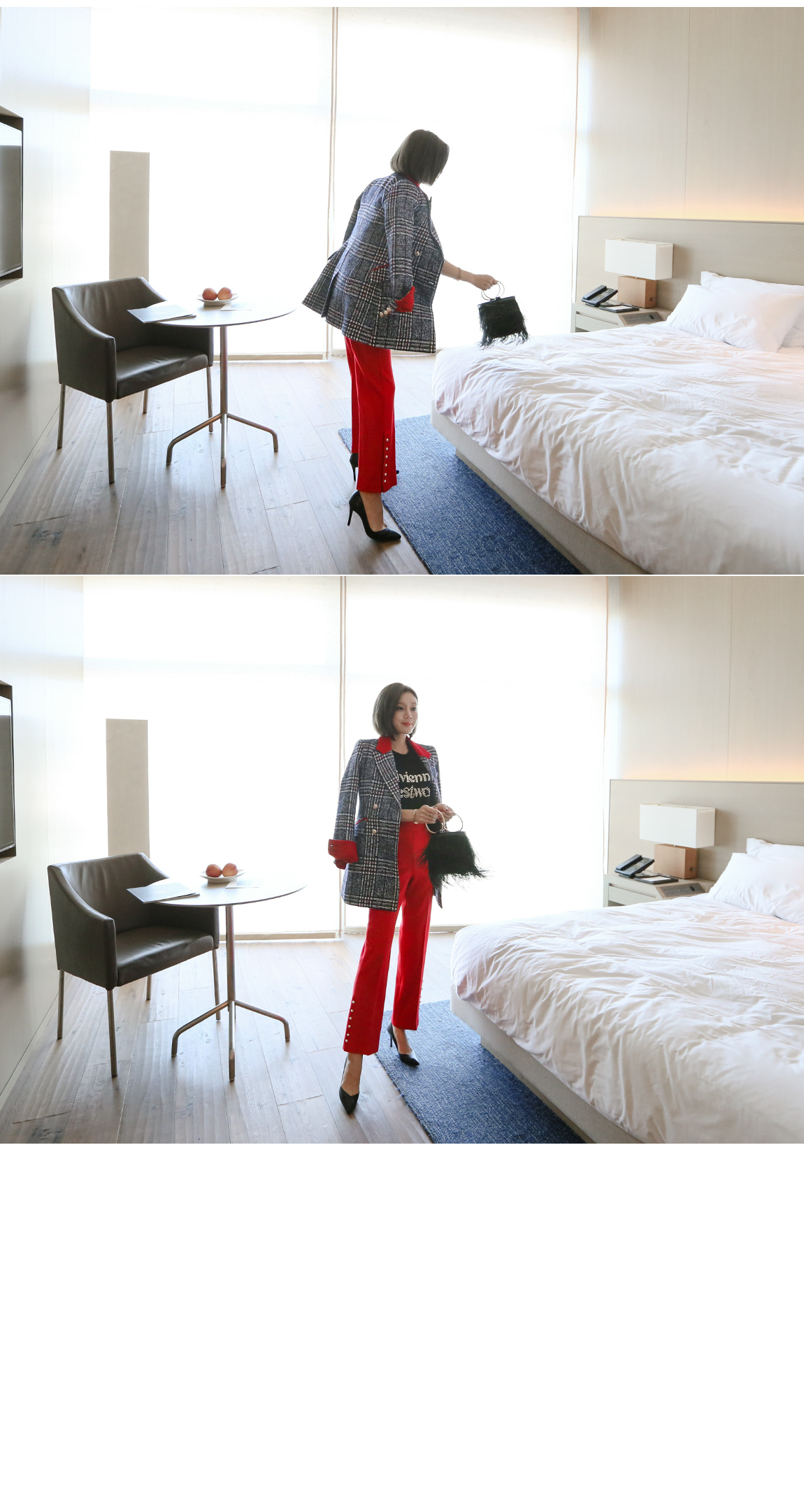숄더에 패드가 내장되어있어 전체적인 밸런스를 잡아줘요 재단에 따라 패턴은 다를 수 있으나 전체적인 스타일은 같아요 소매 배색으로 다양한 연출이 가능해요
