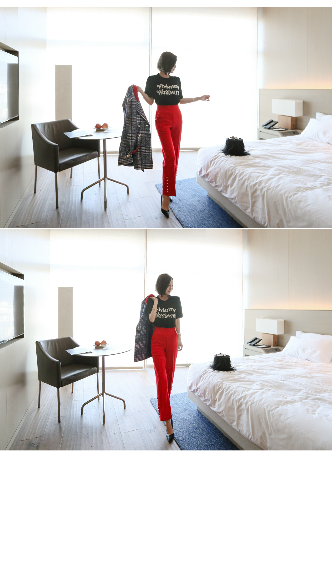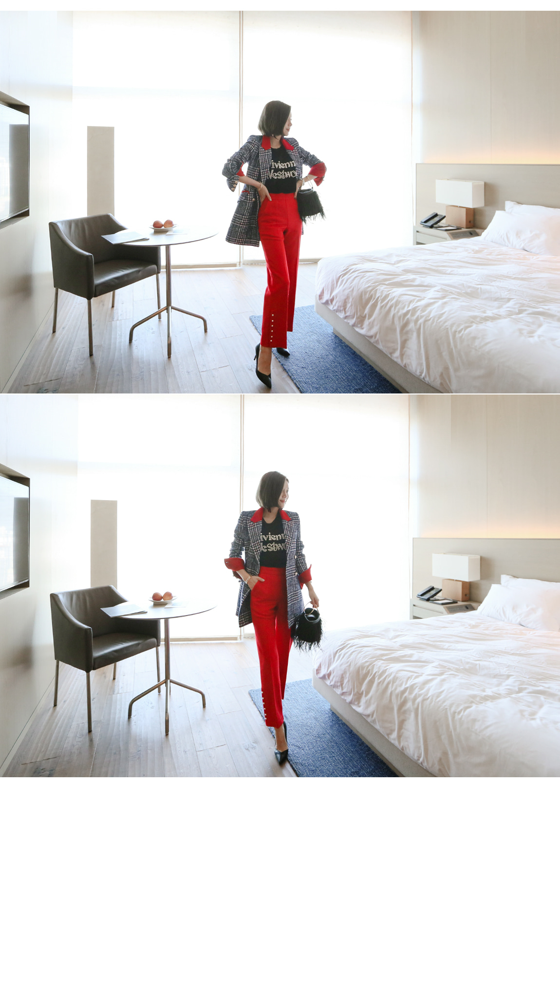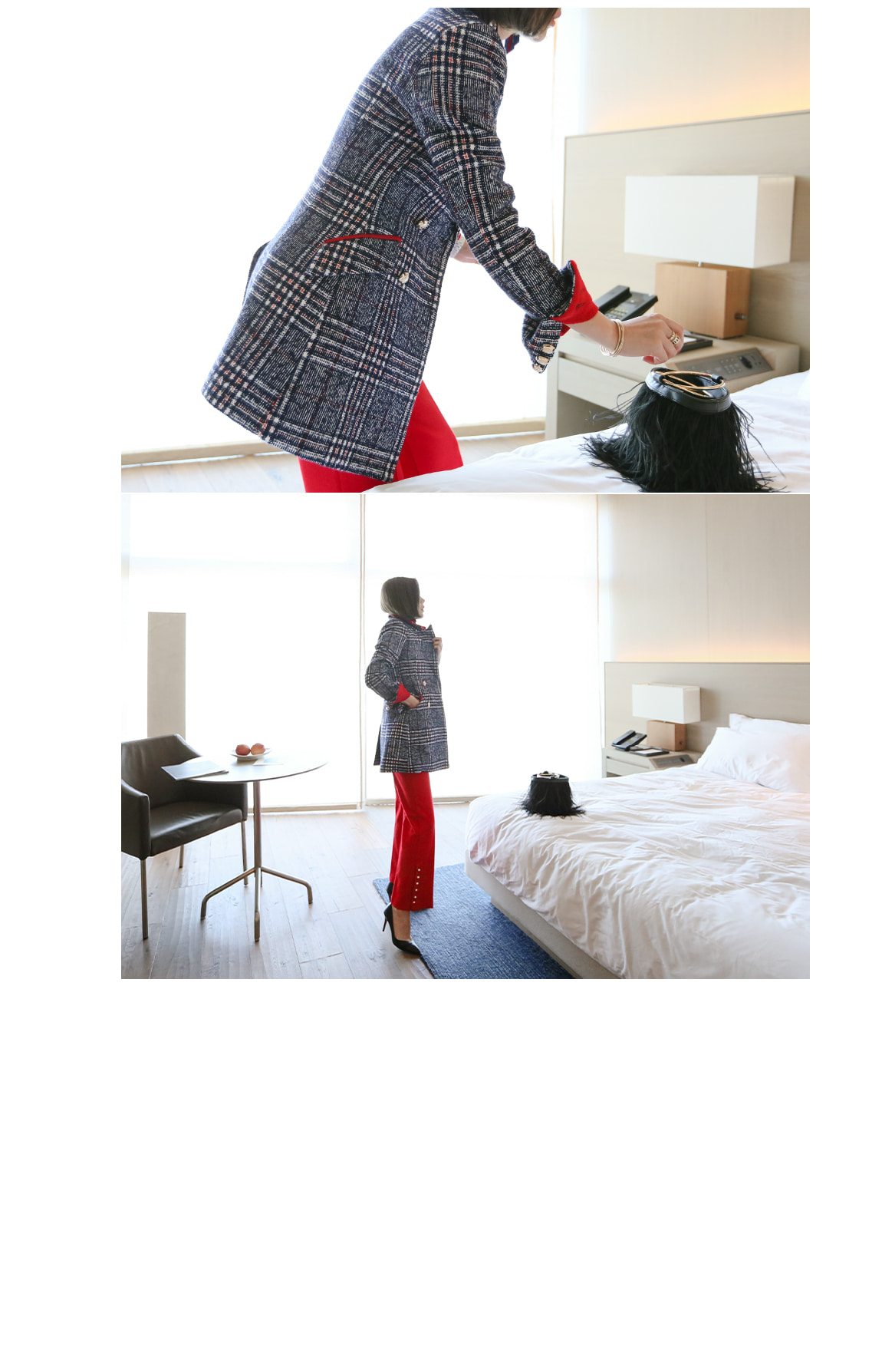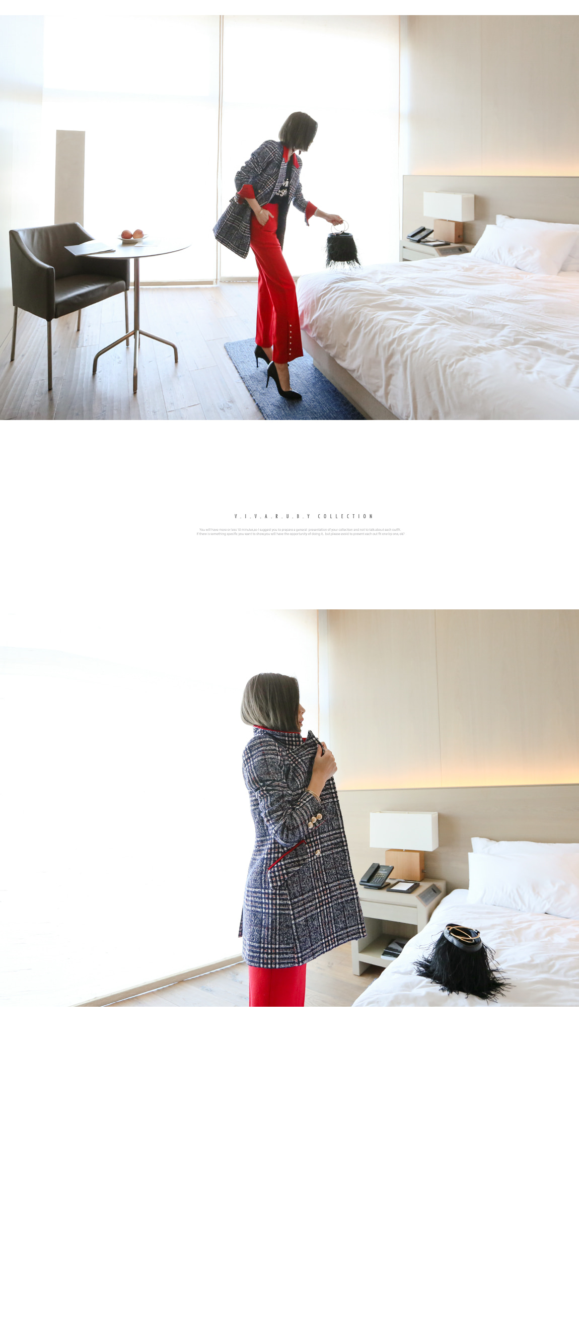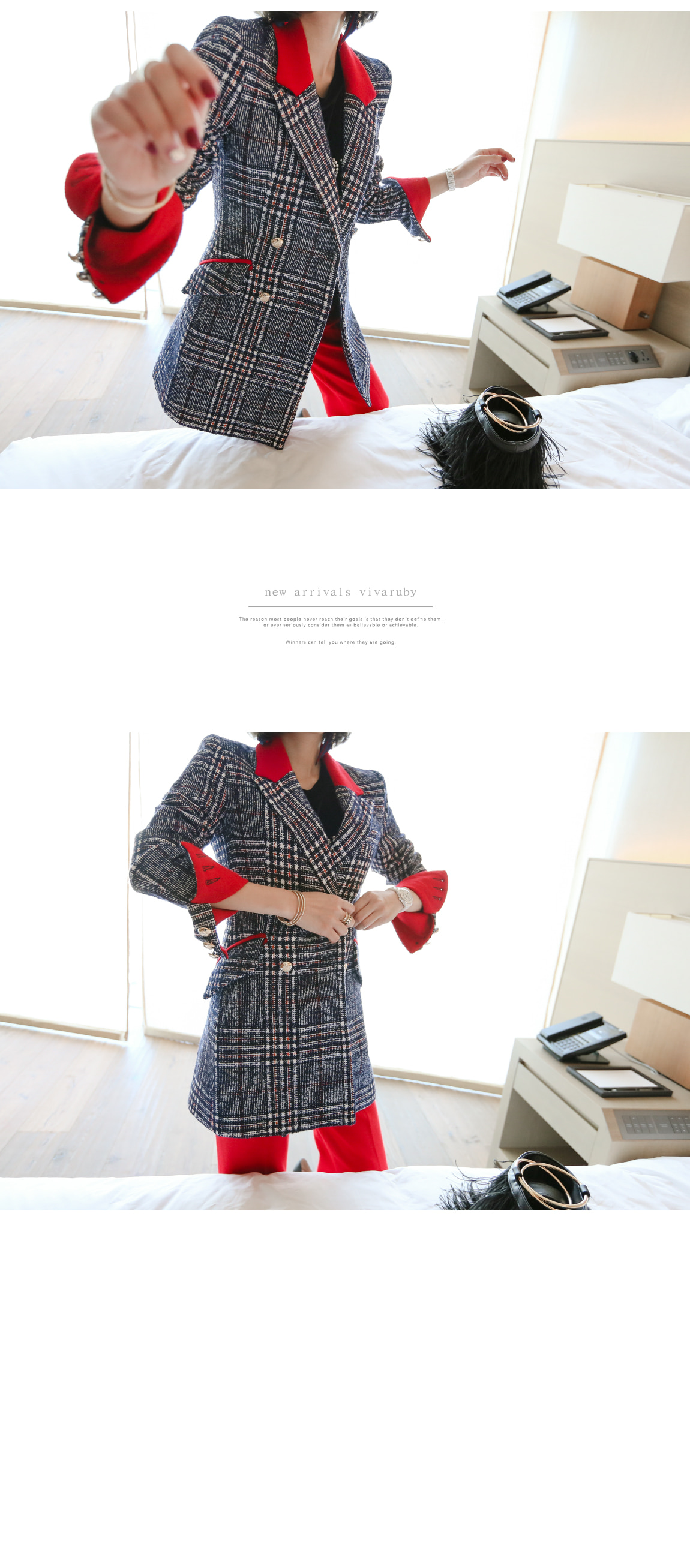 숄더에 패드가 내장되어있어 전체적인 밸런스를 잡아줘요 재단에 따라 패턴은 다를 수 있으나 전체적인 스타일은 같아요 소매 배색으로 다양한 연출이 가능해요