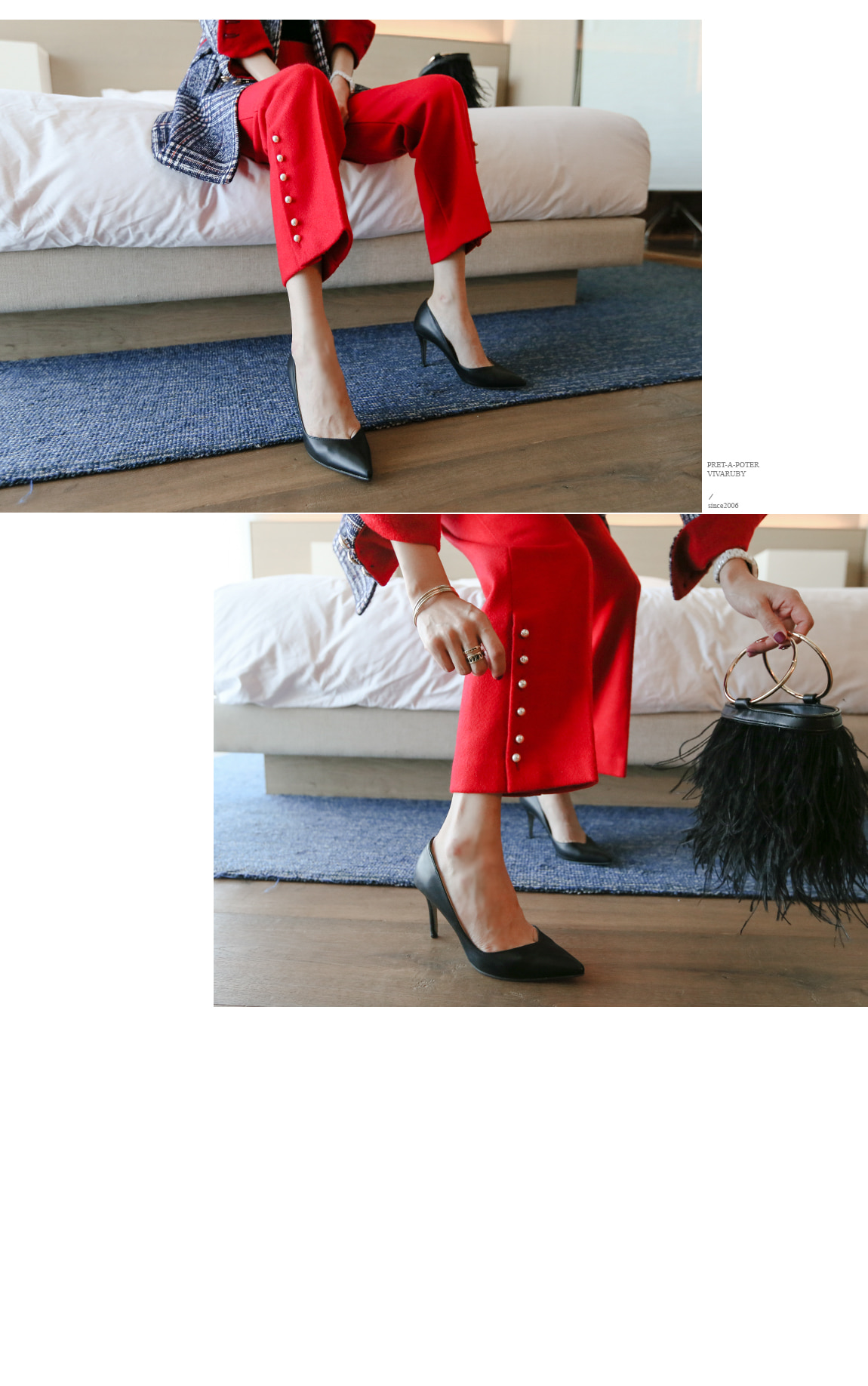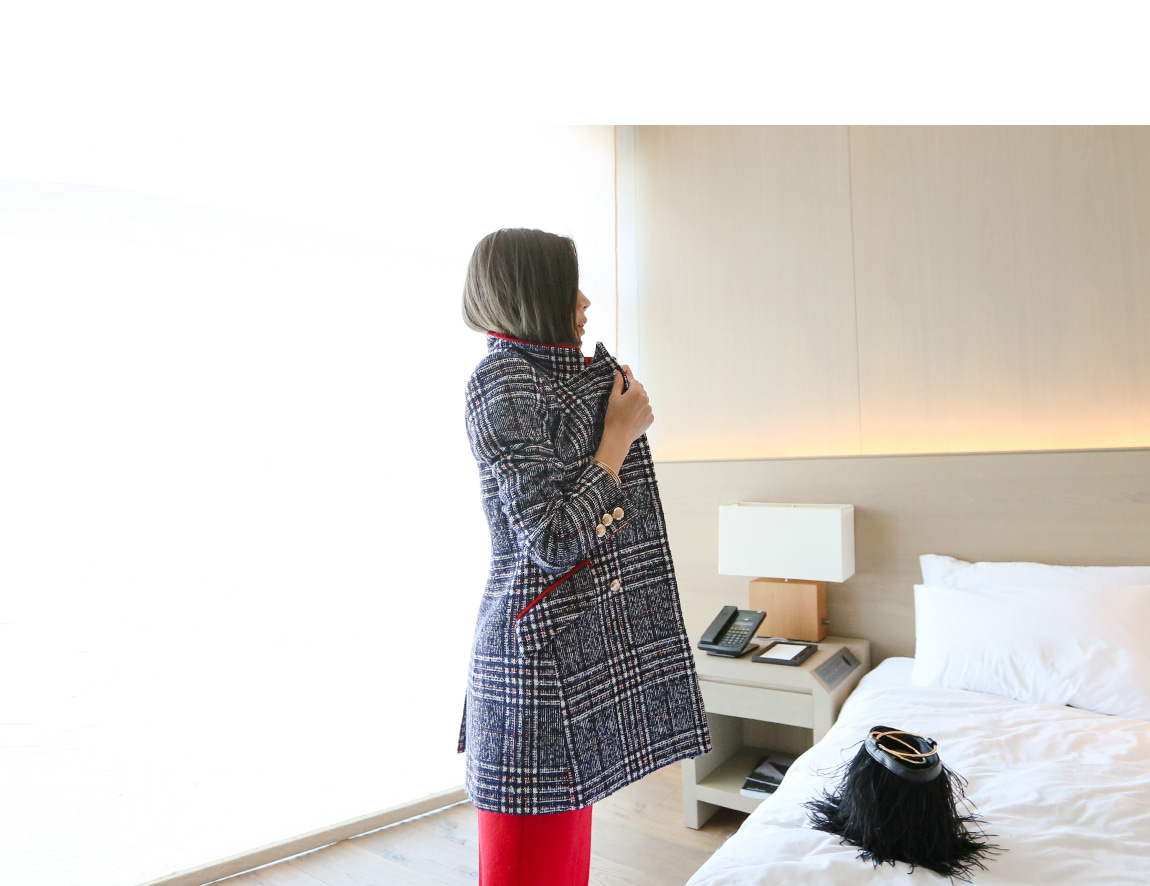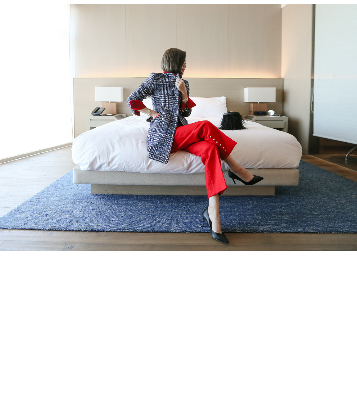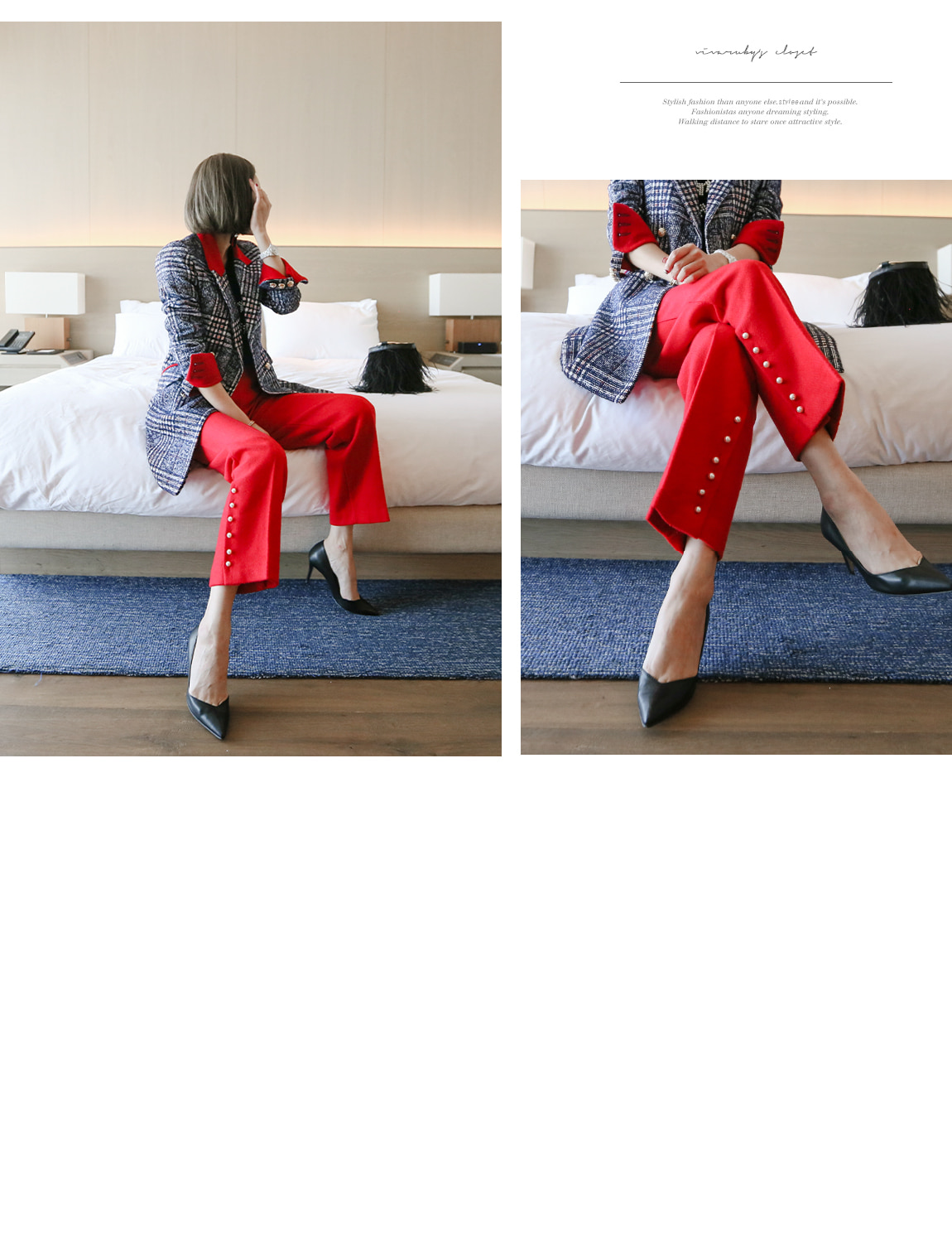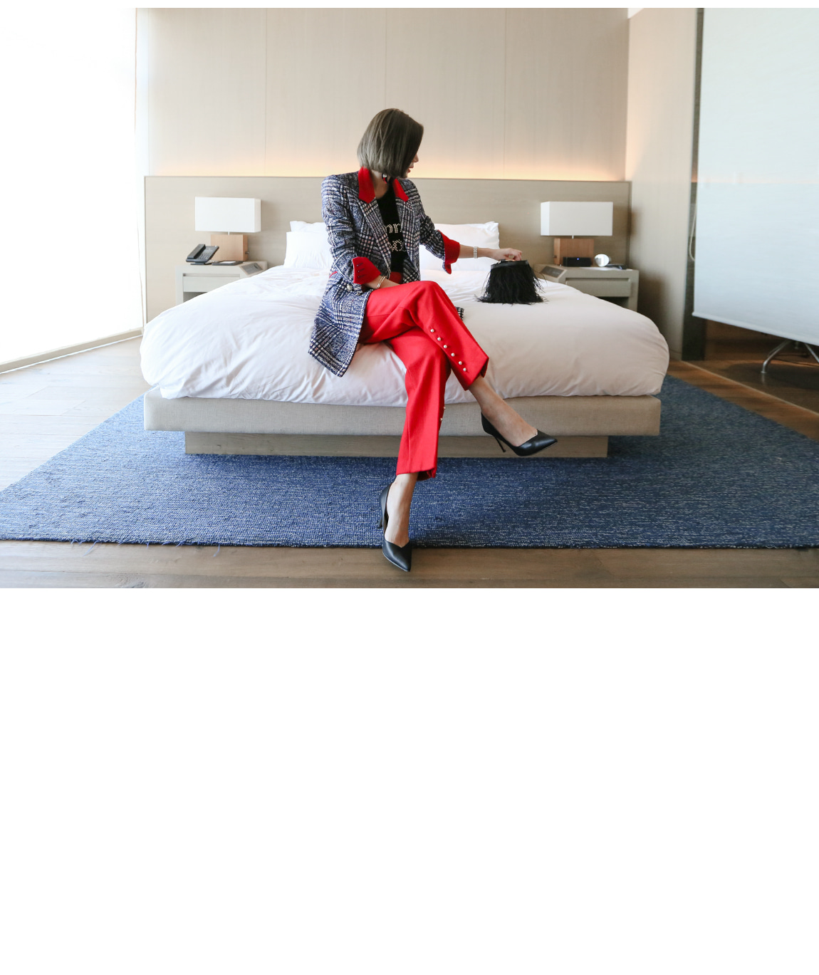 숄더에 패드가 내장되어있어 전체적인 밸런스를 잡아줘요 재단에 따라 패턴은 다를 수 있으나 전체적인 스타일은 같아요 소매 배색으로 다양한 연출이 가능해요