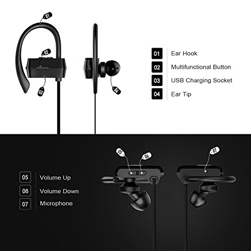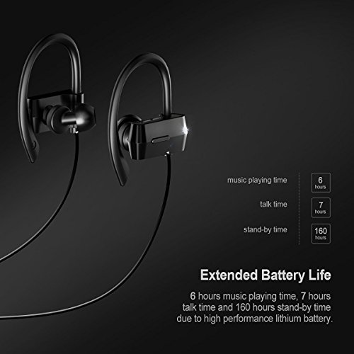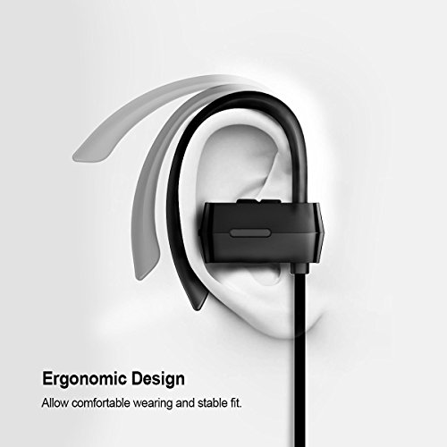 Feature : Never Fall Down: The ergonomically-shaped ear hooks increase wearing comfort and always keep ear-buds in place during day-to-day use, never fall out even during running, jogging, yoga, etc. / Comfortable and Secure Fit: The angled-in silicone ear tips are extra soft and flexible to sit securely in the ear canals, making the wearing unnoticed even for long time, multi-sized eartips for you to find the best fit one. / Noise Cancellation: CVC 6.0 noise cancellation tech intelligently filters most ambient sound, combining the expert HD mic with better voice reception provides you clear, pleasant call chat and music. / Bluetooth V4.0 and Universal Connectivity: Fast and easy connection with latest Bluetooth V4.0 tech, compatible with iPhone 7/6/6 plus/6s/6s plus, 5/5s/5c/SE, iPad 4, iPad Mini, Air, iPod Touch, Samsung HTC, Blackberry, Tablets, MP4, etc. / Long Battery Life: High performance battery offers a rapid full charge of around 1.5h ,provide last up to 6 hours of playtime/7 hours of talk time and 160 hours stand by time.