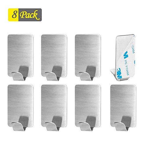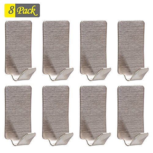 Adhesive Wall Hooks, Self Sticky Key Hooks, 8-Pack Strong Stainless Steel Metal Hooks, Waterproof No Drill No Damage Nailless Towel Hooks for Coat Robe Coffee Mug, for Bathroom Kitchen Office Shower