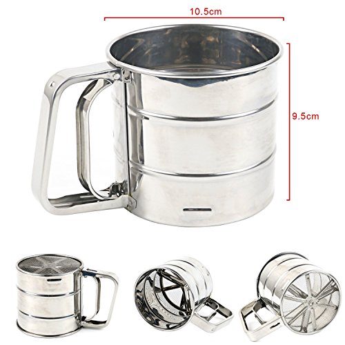 Features: - Sieve powder is designed to make flour fluffy. - Effectively remove clumps and debris from flour. - Mechanical mug style design, easy to use, sift more evenly. - Hold the handle, put the flour into the flour sieve, shake gently,flour will come out. - Can be controlled by one hand only. - Easy to clean,safe packing.