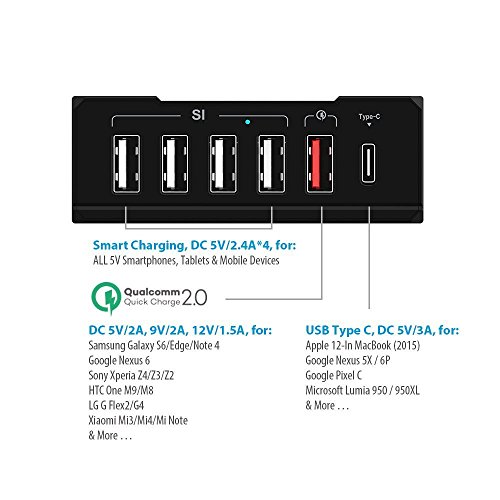 All-in-One Charging Station - Features 4 x universal smart-charging USB ports (USB 2.0/3.0 Supported), 1 x Qualcomm quick charge 2.0 port and 1 x USB Type C port. Perfect for charging up to 6 tablets, Smart phones or other USB devices at full speed simultaneously.