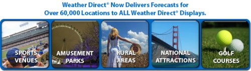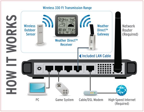-. Feature : 4 day internet powered wireless forecaster / Free accurate forecasts / No subscription / 4 day accurate weather for over 60,000 locations / Web-based 4-day wireless weather forecaster with service for over 60,000 locations / Displays daily temperature forecasts, sky conditions, with 6-hour updates; in/out temps / Customizable weather data and alerts sent via email; self-setting clock with custom alarm / Gateway connects to any router; broadcasts to display device up to 300 feet away / Includes gateway LAN cable and AC adapter for router connection, wireless thermometer