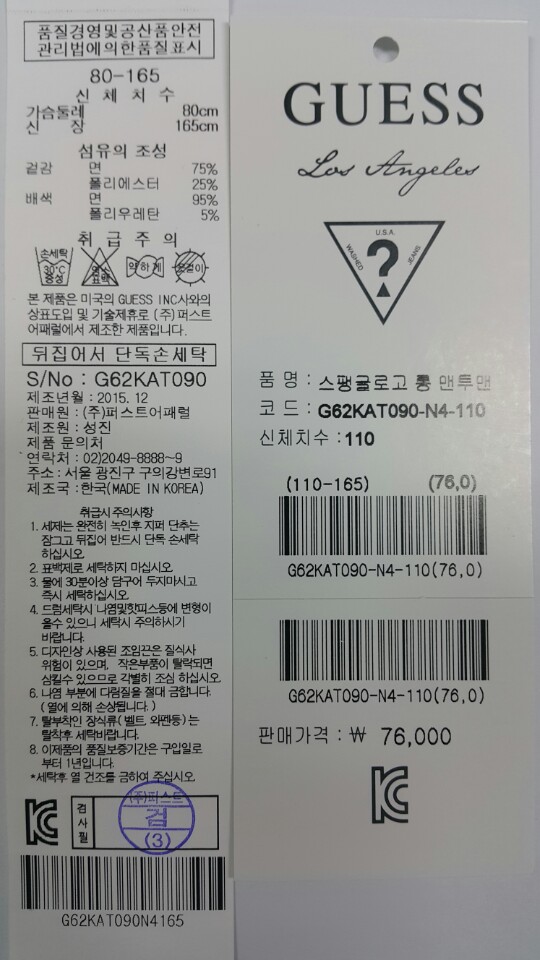 - 겉감 면 75% 폴리에스터 25% 배색 면 95% 폴리우레탄 5%