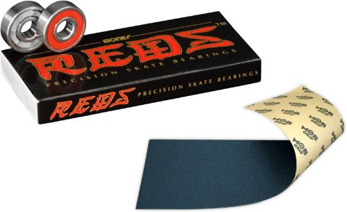 -. Feature : Hundreds of barely-visible perforations that allow air to escape for a bubble-free application. Exclusive silicon-carbide grit binding process for grip that will not wear out. High-strength, waterproof, tear-proof backing that trims cleanly every time. Super sticky adhesive that won't peel in extreme heat or cold. / The bestselling skate bearing brand in the USA, Bones REDS are manufactured to Bones Skate Rated specifications in a manufacturing facility dedicated to producing the highest quality skate bearings possible. They are thoroughly inspected before being shipped, and offer an outstanding combination of performance, durability, and low cost. Features Single, non-contact, removable rubber shield for easy cleaning and less friction High speed nylon ball retainer for greater strength and speed Pre-lubricated with Speed Cream racing lubricant Skate Rated clearances, tolerances, materials, and lubricant